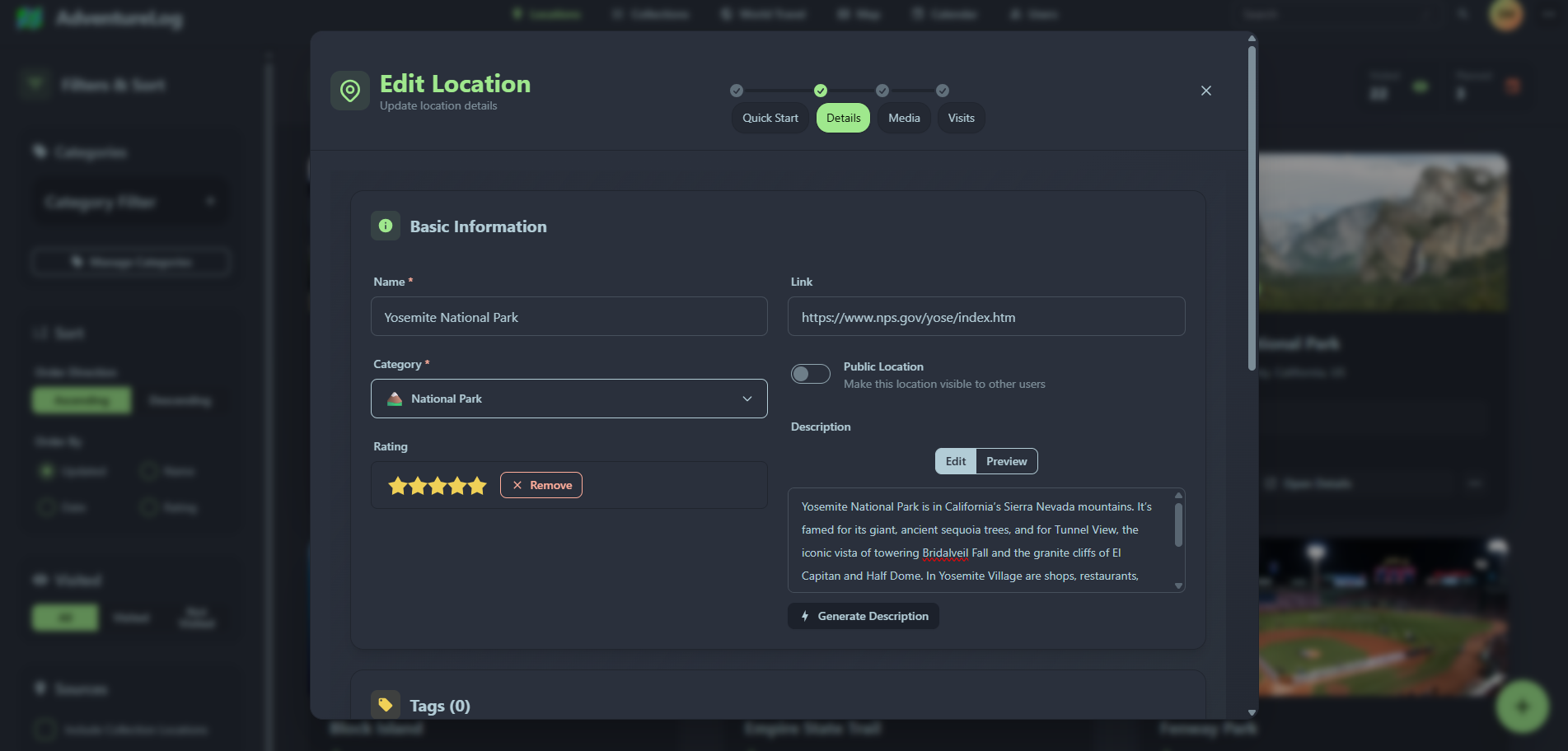 * Implement code changes to enhance functionality and improve performance * Update nl.json Fix Dutch translations. * feat(security): add Trivy security scans for Docker images and source code * feat(security): restructure Trivy scans for improved clarity and organization * fix(dependencies): update Django version to 5.2.2 * style(workflows): standardize quotes and fix typo in frontend-test.yml * feat(workflows): add job names for clarity in backend and frontend test workflows * refactor(workflows): remove path filters from pull_request and push triggers in backend and frontend workflows * feat(workflows): add paths to push and pull_request triggers for backend and frontend workflows * refactor(workflows): simplify trigger paths for backend and frontend workflows fix(dependencies): add overrides for esbuild in frontend package.json * fix(package): add missing pnpm overrides for esbuild in package.json * fix(workflows): add missing severity parameter for Trivy filesystem scan * fix(workflows): add missing severity parameter for Docker image scans in Trivy workflow * fix(workflows): remove MEDIUM severity from Trivy scans in security workflow * added-fix-image-deletion (#681) * added-fix-image-deletion * feat(commands): add image cleanup command to find and delete unused files * fix(models): ensure associated AdventureImages are deleted and files cleaned up on Adventure deletion * fix(models): ensure associated Attachment files are deleted and their filesystem cleaned up on Adventure deletion --------- Co-authored-by: ferdousahmed <taninme@gmail.com> Co-authored-by: Sean Morley * Rename Adventures to Locations (#696) * Refactor user_id to user in adventures and related models, views, and components - Updated all instances of user_id to user in the adventures app, including models, serializers, views, and frontend components. - Adjusted queries and filters to reflect the new user field naming convention. - Ensured consistency across the codebase for user identification in adventures, collections, notes, and transportation entities. - Modified frontend components to align with the updated data structure, ensuring proper access control and rendering based on user ownership. * Refactor adventure-related views and components to use "Location" terminology - Updated GlobalSearchView to replace AdventureSerializer with LocationSerializer. - Modified IcsCalendarGeneratorViewSet to use LocationSerializer instead of AdventureSerializer. - Created new LocationImageViewSet for managing location images, including primary image toggling and image deletion. - Introduced LocationViewSet for managing locations with enhanced filtering, sorting, and sharing capabilities. - Updated ReverseGeocodeViewSet to utilize LocationSerializer. - Added ActivityTypesView to retrieve distinct activity types from locations. - Refactored user views to replace AdventureSerializer with LocationSerializer. - Updated frontend components to reflect changes from "adventure" to "location", including AdventureCard, AdventureLink, AdventureModal, and others. - Adjusted API endpoints in frontend routes to align with new location-based structure. - Ensured all references to adventures are replaced with locations across the codebase. * refactor: rename adventures to locations across the application - Updated localization files to replace adventure-related terms with location-related terms. - Refactored TypeScript types and variables from Adventure to Location in various routes and components. - Adjusted UI elements and labels to reflect the change from adventures to locations. - Ensured all references to adventures in the codebase are consistent with the new location terminology. * Refactor code structure for improved readability and maintainability * feat: Implement location details page with server-side loading and deletion functionality - Added +page.server.ts to handle server-side loading of additional location info. - Created +page.svelte for displaying location details, including images, visits, and maps. - Integrated GPX file handling and rendering on the map. - Updated map route to link to locations instead of adventures. - Refactored profile and search routes to use LocationCard instead of AdventureCard. * docs: Update terminology from "Adventure" to "Location" and enhance project overview * docs: Clarify collection examples in usage documentation * feat: Enable credentials for GPX file fetch and add CORS_ALLOW_CREDENTIALS setting * Refactor adventure references to locations across the backend and frontend - Updated CategoryViewSet to reflect location context instead of adventures. - Modified ChecklistViewSet to include locations in retrieval logic. - Changed GlobalSearchView to search for locations instead of adventures. - Adjusted IcsCalendarGeneratorViewSet to handle locations instead of adventures. - Refactored LocationImageViewSet to remove unused import. - Updated LocationViewSet to clarify public access for locations. - Changed LodgingViewSet to reference locations instead of adventures. - Modified NoteViewSet to prevent listing all locations. - Updated RecommendationsViewSet to handle locations in parsing and response. - Adjusted ReverseGeocodeViewSet to search through user locations. - Updated StatsViewSet to count locations instead of adventures. - Changed TagsView to reflect activity types for locations. - Updated TransportationViewSet to reference locations instead of adventures. - Added new translations for search results related to locations in multiple languages. - Updated dashboard and profile pages to reflect location counts instead of adventure counts. - Adjusted search routes to handle locations instead of adventures. * Update banner image * style: Update stats component background and border for improved visibility * refactor: Rename AdventureCard and AdventureModal to LocationCard and LocationModal for consistency * Import and Export Functionality (#698) * feat(backup): add BackupViewSet for data export and 